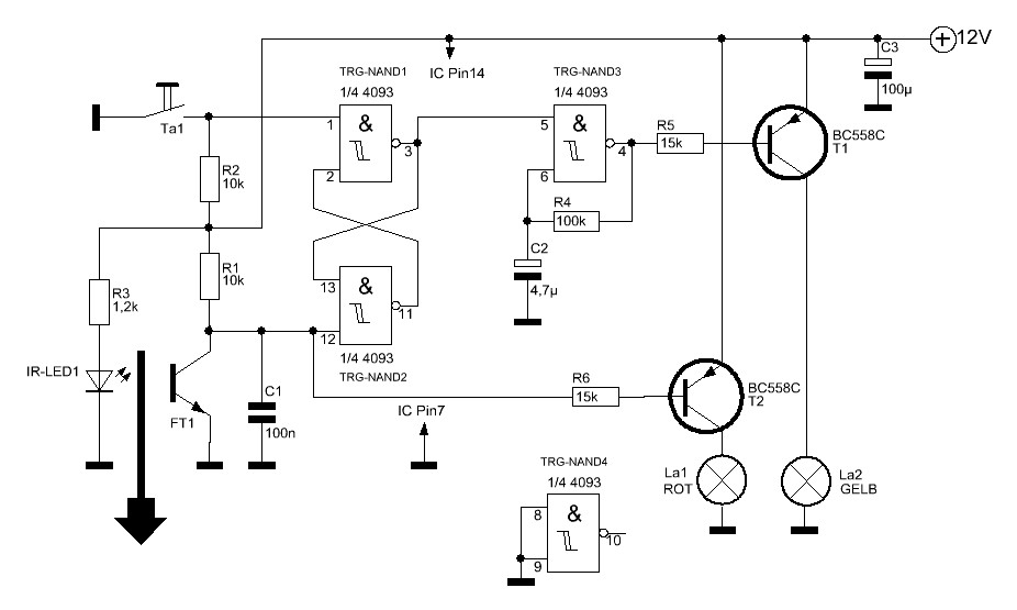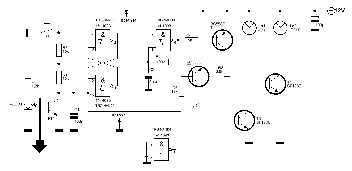 für die Signalzustansspeicherung braucht Du einen bistabilen Multivibrator. Ich sehe aber nur einen Schmidt-Trigger und einen astabilen Multivibrator. Oder übersehe ich hier eine Trickschaltung. Der Triger müßte also durch einen Flip-Flop ersetzt werden.