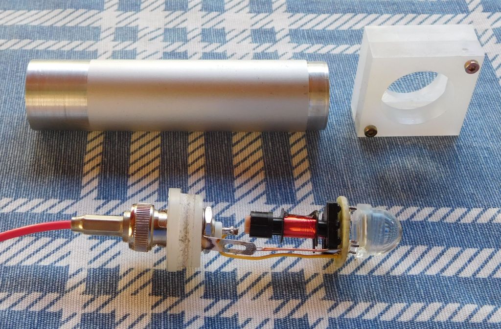 jetzt habe ich schon mal meinen 'Empfänger' neu eingekleidet. Ich komme jetzt mit zwei Konvex-Linsen auf 5 Meter. Da ist aber noch viel mehr drin. Mal schauen wo ich geeignete (erschwingliche) Optiken bekomme. Wie schon beschrieben, für den Empfänger verwende ich nur eine Spule (Übertrager) in Resonanz. Mit zusätzlicher Elektronik wäre es natürlich besser, aber jeder Liebhaber für Detektorempfänger wird mich hier verstehen.