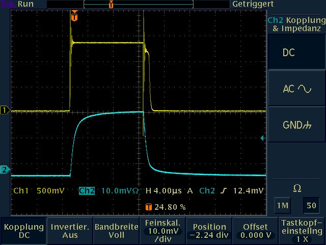 da hast Du schon Recht, denn durch die I-Schicht sind diese Dioden sind in ihrem gesamten nutzbaren Wellenlängenbereich sehr schnell, denn durch diese Schicht verringert sich die Sperrschichtkapazität. Das Problem ist nur dieser Slow-Tail-Effekt der ab ca. 700nm deutlich auftritt. Für eine digitale Übertragung ist das nicht 'so' ein grosses Problem, aber bei einem AM modulierten Sinus ist das störend. Im angehängten Bild sieht man zwei Kanäle. Der Kanal1 (gelb) zeigt den Spannungsverlauf an einer IR-LED (880nm). Sorry, die Störungen stammen von einem schlechten LED-Treiber. Der untere Kanal (blau) zeigt das Ausgangssignal der Photodiode. Das ansteigende Signal ist zuerst relativ Steil, aber dann dauert es lange bis das Maximum erreicht wird. Bei der abfallenden Flanke sieht man den gleichen Effekt. Der Grund ist, dass die Photonen im IR-Bereich tiefer in das Silizium eindringen (ab ca 1,13um ist Silizium völlig transparent) und dann in der N-Schicht Elektronen auslösen.