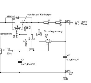 Nun sind die 0,7V nur angenommen. Je nach Transistortyp kann die B-E-Spannung bei Si zwischen 0,5....0.75 liegen. T2 sollte im Interesse einer guten Regelung eine hohe Stromverstärkung haben - möglichst über 200. Auch wäre ein Darlington möglich - dann aber mit doppelter B-E-Spannung 1,4V rechnen. R1 kann kleiner ausfallen oder ganz gebrückt werden und R4 kann auf 100k erhöht werden, da wird die Regelung des Stromes besser.