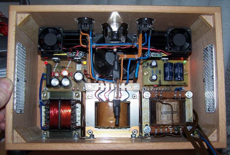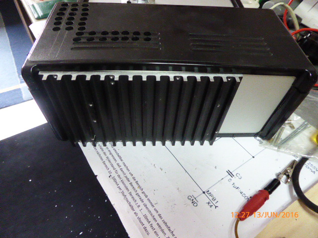 darum habe ich in meinem ersten Netzteil auf die innenliegenden Kühlkörper je einen kleinen Temperatur gesteuerten Ventilator gesetzt und außerdem in die Rückwand noch einen dauernd laufenden größeren Lüfter eingebaut.