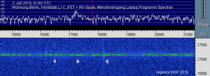 es hat sich was empfangen lassen! Hier ein Ausschnitt und die Apparatur. Im Einsatz waren zeitgleich Spectran und SAQ VLF Receiver v094. Wave Dateien sind aufgezeichnet. Es ist nicht besonders gut, aber immerhin.