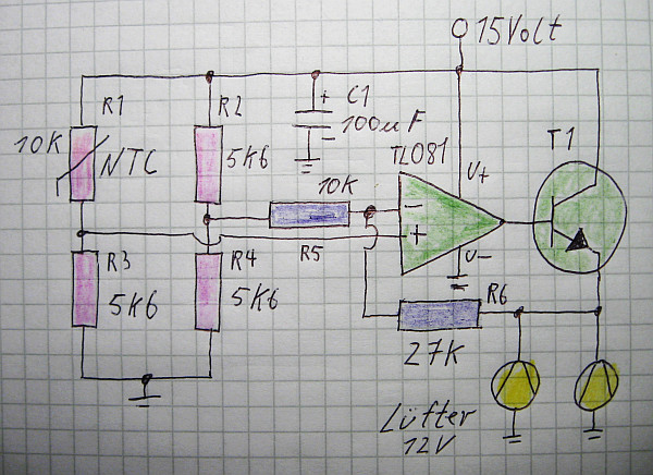 Inzwischen ist mein Netzteilprojekt wahrscheinlich endlich abgeschlossen, nachdem es eine temperaturabhängige Lüfterregelung erhalten hat. Die Schaltung ist einfach gehalten und hat sich bewährt: