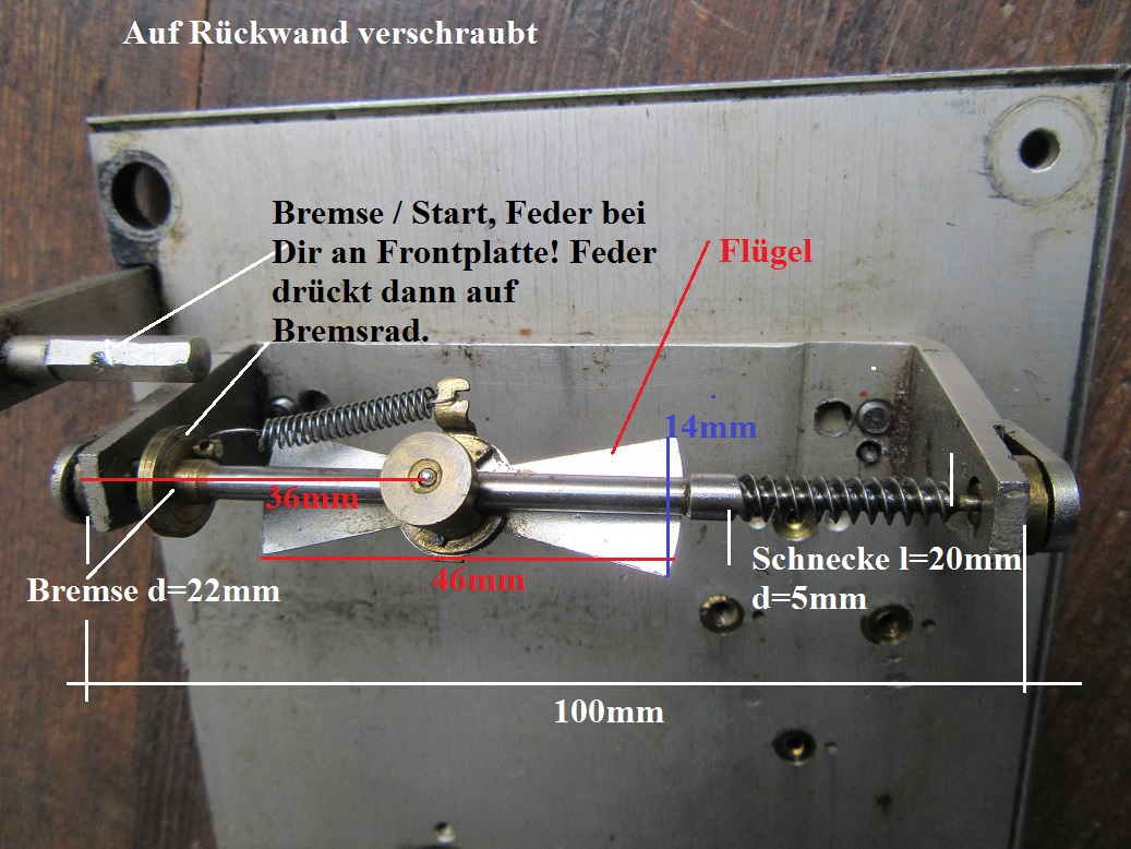 so sollte eigentlich ein Regler funktionieren. Siehe Grammophon Link ganz unten. (Leerzeichen vorn) Die Flügelchen meines Telegraphen- Fliehkraftreglers sind etwa 30-35 Grad nach rechts außen drehend auf einem Kugelkopf beweglich aufgehängt und über die Feder müsste die Bremsscheibe an einen Widerstand, z.B. Filzschuhbremse gedrückt werden. Die Scheibe muss achsial beweglich sein. Diese Bremse ist gleichzeitig bei Start Stop aktiv. Leider bewegt sich meine Bremsscheibe nicht mehr und Filz ist am Hebel / Feder an der Frontplatte nicht mehr vorhanden. Siehe letztes Bild (Seitenansicht).