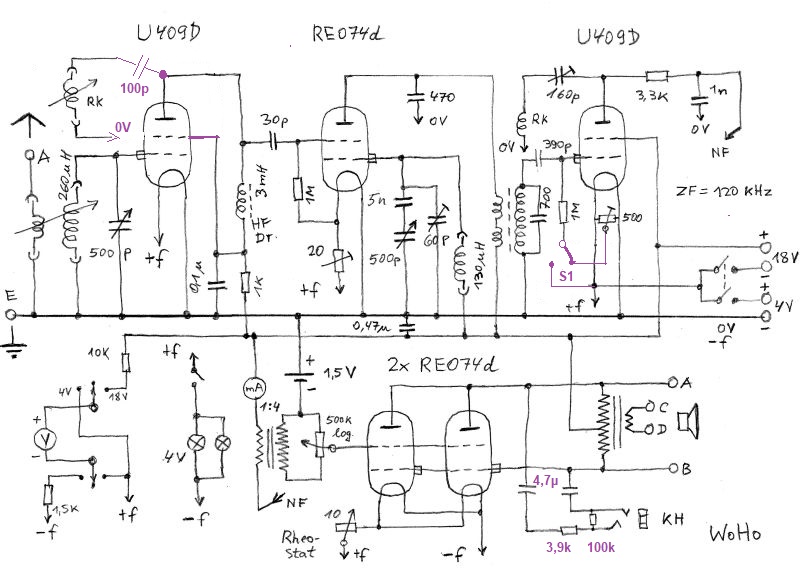 1. Mich störte die ungenaue Rückkopplungseinstellung an der HF-Vorstufe. Der Schwingungsein- und -aussatz war nicht nahegenug an der gleichen Stelle, Hysterese nennt man sowas. Abhilfe brachte ein geänderter Anschluss der schwenkbaren Rückkopplungsspule. Dieser liegt jetzt an der Anode und nicht mehr am Schirmgitter!