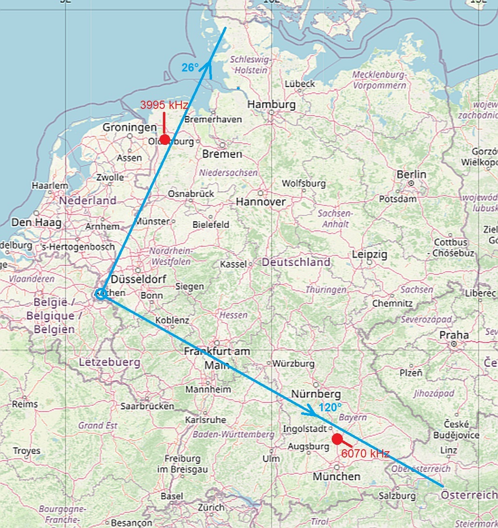 3995 kHz aus der Nähe von Leer, Ostfriesland. Peilung ~ 26°. 6070 kHz Rohrbach, SSO von Ingolstadt. Peilung ~ 120°