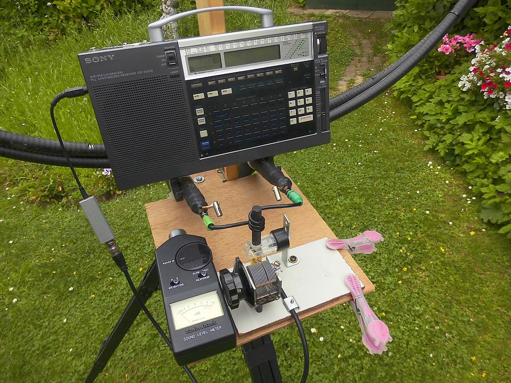Der Antennenstrom wird mit 3 Windungen auf einen angezapften Selektionskreis gekoppelt. Ein gerader verfügbarer Ferritstab für die MW dient als induktives Koppelelement. Wichtig ist, dass dieser lotrecht steht, damit keine ungewollte Einsteuung das Empfangsminimum beeinflusst! Sicherlich würde ein für die KW gedachter Ringkern bessere Ergebnisse bringen, was die Empfindlichkeit betrifft. Der Empfänger ist der SONY ICF 2001D und als Lautstärkeindikator ein Pegelmesser für den Überlagerungston in Stellung SSB.