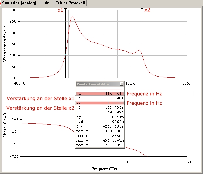Im oberen Teil der Simulation ist die Verstärkung linear dargestellt (bei logarithmischer Achsteilung ist sieht das Ganze wesentlich 'ziviler' aus), so dass sie besser mit der anschließenden Messung am aufgebauten Filter verglichen werden kann. Das Filter ist für eine Mittenfrequenz von 800Hz konzipiert und hat eine Bandbreite von ca 400Hz-500Hz. Mit etwas gutem Willen kann man die Tschebyscheffcharakteristik erkennen.