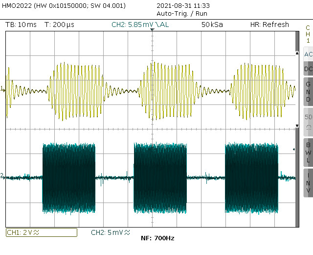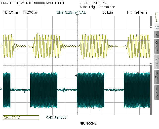 Die folgenden Abbildungen zeigen die Reaktion des Filters auf 'echte' Signale, die an verschiedenen Stellen der Durchlaßkurve des Filters liegen. Prüfsignal ist ein 20kHz-Burst, der in die NF-Lage heruntergemischt wird. In den Abbildungen ist die Frequenz des entstandenen NF-Signals angeben. Gelbe Spur Filterausgang , blaue Spur Eingangssignal Die geringste Veränderung des zeitlichen Verlaufs des Prüfsignals zeigt sich bei 800Hz. Diese Frequenz bietet sich daher an, wenn eine auschließende 'maschinelle' Auswertung erfolgen soll.