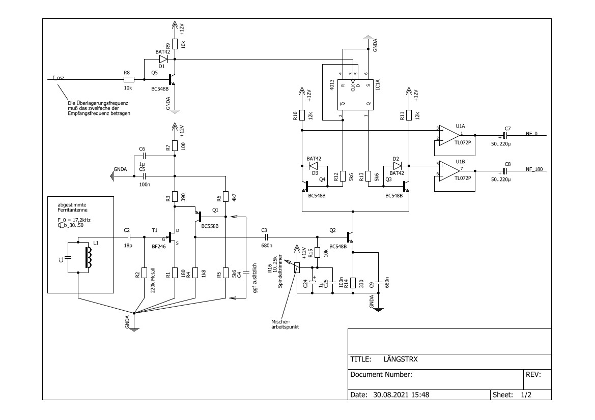 Ein interessantes Konzept, verrätst Du uns auch weitere Details der Schaltung, z.B. des Gegentaktmischers? Wie es ausschaut, ist er diskret aufgebaut. Dein Beitrag im Nachbaruniversum ist interessant. Besonders beeindruckend ist die hohe Güte der Ferritantenne bei 17,2kHz - hätte ich angesichts der langen Spulenwicklung nicht vermutet. Wie in Deinem Video zu sehen ist, funktioniert der RX recht gut und das indoor. Von solchen Verhältnissen kann ich hier nur noch träumen. Der Abstimmindikator ist das i-Tüpfelchen