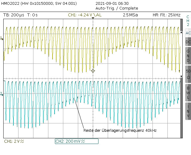 Das Überlagerungssignal wird von der Differenzfrequenz (800Hz) eingehüllt, die Kollektorspannungen sind um 180 Grad gegeneinander verschoben. Allerdings ist auch die doppelte Überlagerungsfrequenz vorhanden, was wohl durch den Aufbau der Schaltung bedingt ist.