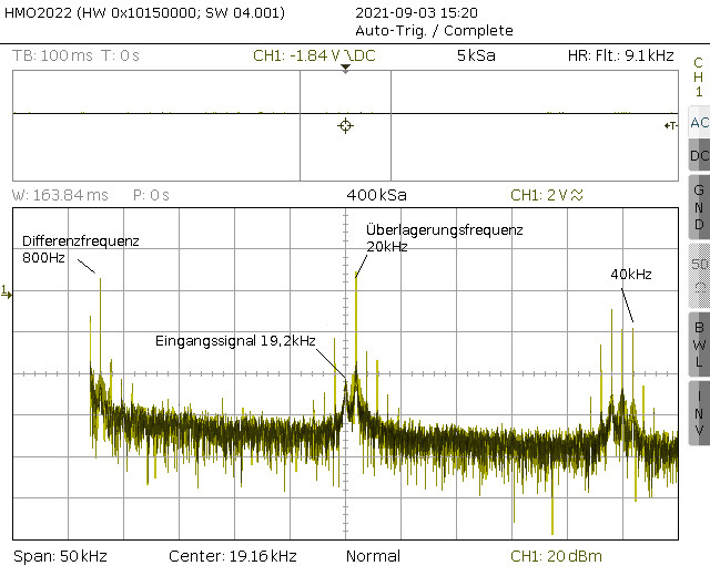 Die Funktion dieses Schaltungsteils des Radios habe ich am Mischerausgang überprüft. Eingangsfrequenz 19,2kHz, Überlagerungsfrequenz 20kHz