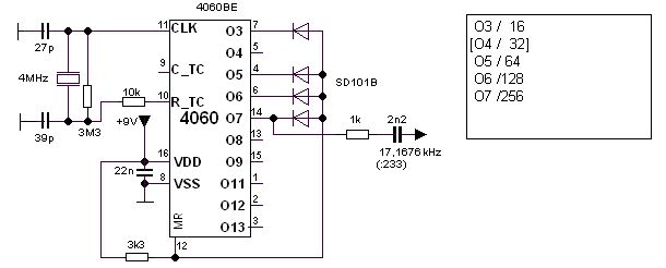 Der Teiler müsste 4002,94 kHz/ 17,18 kHz= 233 betragen, das mit den zur Verfügung stehenden Ausgängen nicht realisiert werden kann. Tatsächlich wird durch 466 geteilt, warum auch immer. Von daher also ein "Unikat"