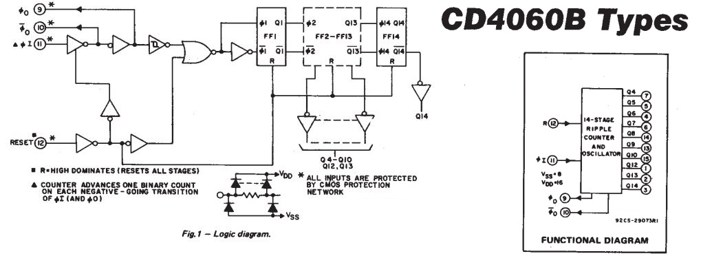 Demnach hast Du die Möglichkeit, den 4060 zu simulieren ? Bei mir ist das Problem, dass der Frequenzzähler bei sehr niedrigen Frequenzen nicht mehr korrekt anzeigt. In der Simulation könnte man aber sehr niedrige Frequenzen anwenden und schauen, ob sich das Teiler-Verhältnis ändert. Im Auszug des Datenblattes des 4060 ist gezeichnet, dass der Reset auch auf den Oszillatorteil wirkt: