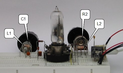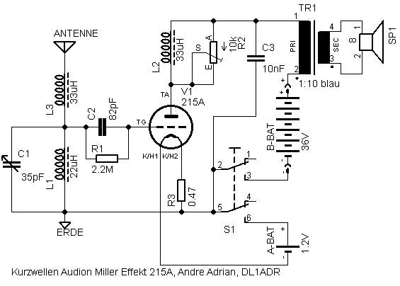 Das Audion benutzt den Miller Effekt für die Rückkopplung. Diese Art der Rückkopplung wurde schon 1915 von Armstrong beschrieben. Rückkopplung wird über R2 eingestellt. Als diese Röhre entwickelt wurde, gab es noch keinen Rundfunk-Sender auf 7 MHz. Deshalb war ich über Empfang bis zum 31m Band sehr erfreut.