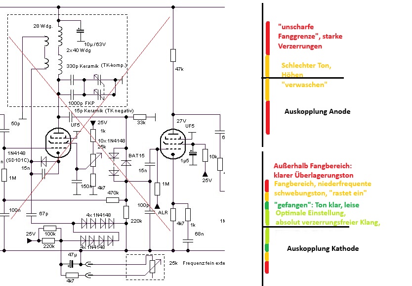 Hinter die Röhre geschaltet, erhält man umgekehrt eine negative Richtspannung, welche den Schwingungseinsatz weicher macht und "Hysterese-Effekte" treten nicht auf, wenn man die vorteilhafte negative Vorspannung stabil (Diode in der Kathodenleitung etc.) macht.