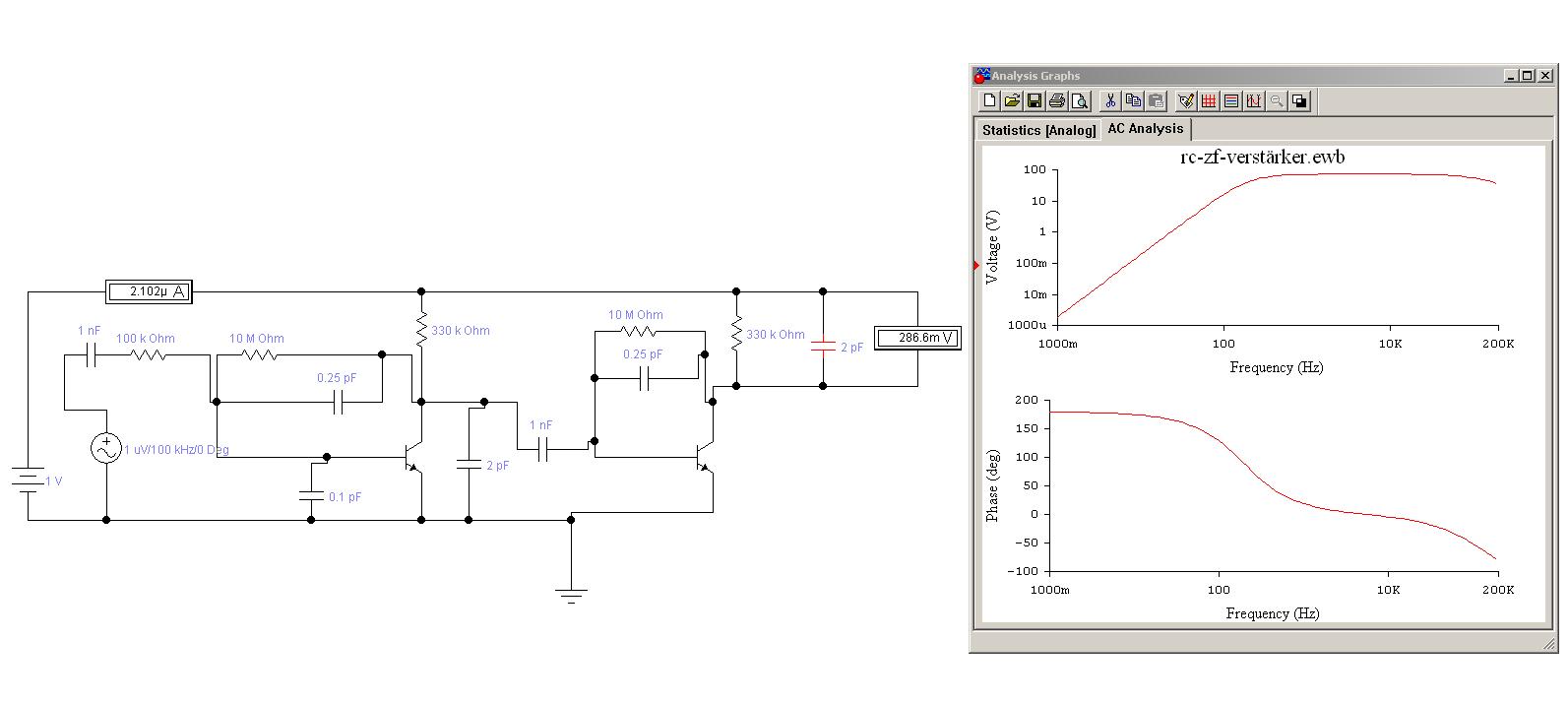 Bandbreite ebenfalls (wie das Original) bis ca 3MHz. Dann mal die Originalschaltung probiert (im HF-Zweig wieder die Eigenkapazitäten des BFR180 verwendet),