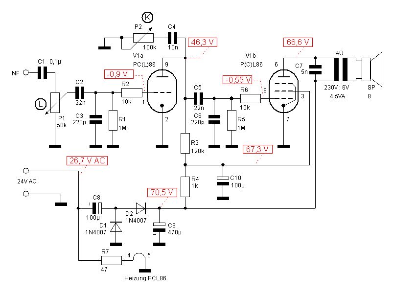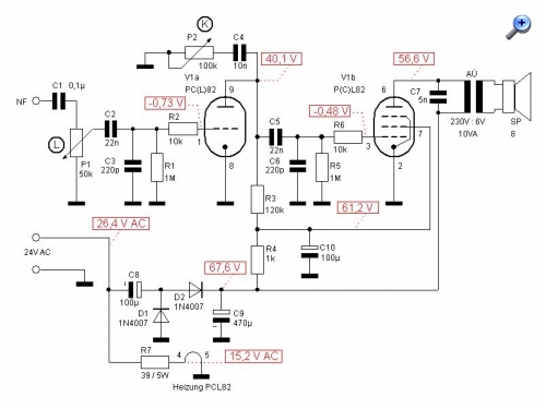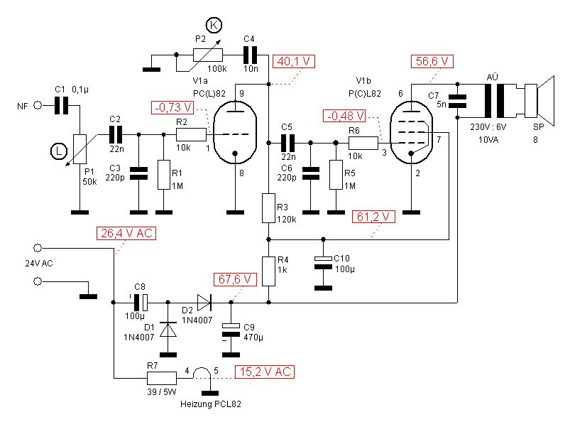 die Schaltung funktioniert auch sehr gut mit der PCL 82. Dazu sind folgende Änderungen nötig: 1. die Sockelbeschaltung ist anders als bei der PCL 86 2. aufgrund der höheren Heizspannung muss der Vorwiderstand R7 auf 39 Ohm verkleinert werden (er sollte schon 5 Watt Leistung aufweisen).