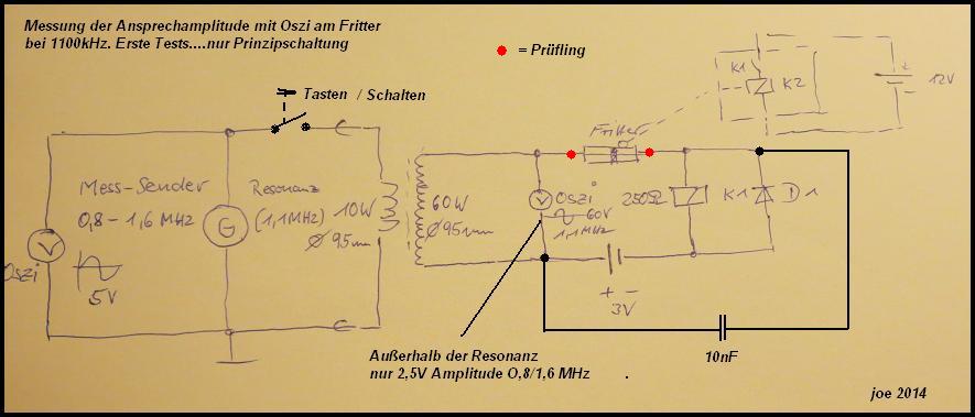 - Dürchzünden meint das Ansprechen des Fritters auf die generierte HF. Das Fritterrelais zieht an und der Klopfer zieht an. - Ich drehte den Frequenzbereich am Generator langsam von 0,8MHz zum Resonanzmaximum bei geschlossenem Schalter. - Bei 1,1 Mhz kam die Beklopfung. Oszi sekundär zeigte knappe 60V Dachwert. - Schalter auf und zu / Fritter spricht an. - Absenkung des Resonanzmaximums. - Schalter auf und zu / Fritter spricht an.