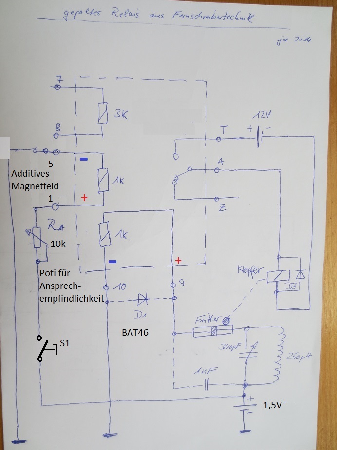 dank der Relaisunterstützung unseres Forumkollegen Bernd (MB-Radio), bin ich nun einen großen Schritt beim abgestimmten Empfang von gedämpften Wellen vorangekommen. Dieses gepolte oder polarisierte Relais hat den großen Vorteil einen sehr großen Innenwiderstand (1k) zu besitzen. Es zieht schon bei 1-2V an und hat somit eine Stromaufnahme von nur 1-2mA. Ideal für die sensible Fritterstrecke. Ein Dauermagnet im Relaiskern macht es möglich. Um die Empfindlichkeit am Eingang 9-10 weiter zu steigern, kann über eine zweite Wicklung 1-5 vor magnetisiert werden. So gelang es mit nur 350mV den Kontakt A-T zu schließen. Durch den hohen Relaiswiderstand, kann der bei kleinen HF- Amplituden auftretende hohe Innenwiderstand der Fritterstrecke, nun perfekt beherrscht werden. Rechnerisch sind also bei 1,5V Fritterkreisspannung und 350mV Spannungsabfall am Eingang 9-10 (1k), auftretende Widerstände von bis zu 3.5k möglich und trotzdem noch wirksam zu verarbeiten. Mit dem Poti R_A wird die Anprechempfindlichkeit eingestellt und zwar so, dass der Relaiskontakt schon fast geschlossen ist. Den Rest besorgt dann der Eingang 9-10. Allerdings muss man hier aufpassen, da eine zu hoch eingestellte Empfindlichkeit auch das Klebenbleiben fördert.