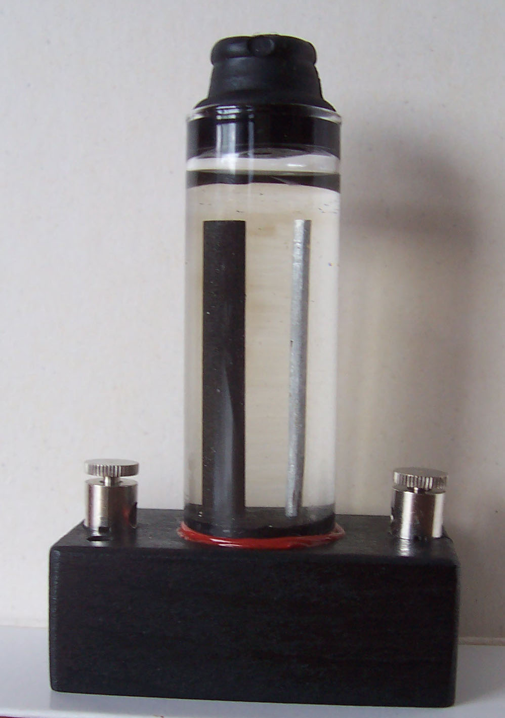 Gesagt , getan, in meine Alchemistenküche gegangen, vieleich klappts dochmal ausversehen Gold zu machen, und die Chemikalien zur Elektrolytherstellung vorgekramt. Als Elektrolyt habe ich eine gesättigte Boraxlösung (Borax in Glyzerol gelöst) genommen - das ist schön neutral zu den Elektroden. Als Elektroden habe ich ein Stück Aluminiumdraht und eine Graphitelektrode aus einer Mignonbatterie genommen. Beide Elektroden in die etwas kleiner gebohrten Löcher in den unteren Gummipfropfen gedrückt. Der obere Gummipropfen hat ein 0.5mm Loch zum Abbau des Überdruckes. Das Glasrohr ist gewöhnliches Laborglas o.ä.
