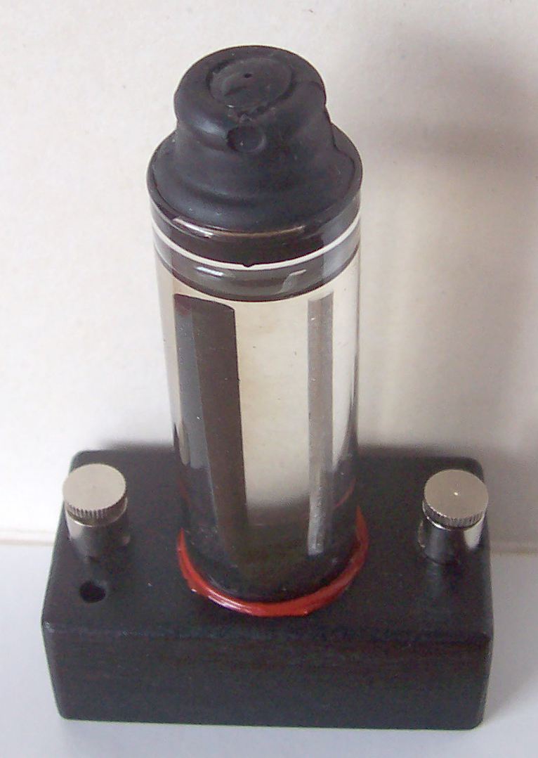 Und so sieht das Ganze dann eingeklebt in einen schwarzen "Hartgummiklotz" (Buchenholz schwarz gebeizt, lackiert und mit Anschlußschrauben versehen aus . Das ist sozusagen jetzt das große Modell für die 12V-Relais. Für das Fritterrelais kann das Ganze kleiner ausfallen und eventuel mit zwei Aluminiumelektroden als Polarisationszelle gebaut, da der Umpolarisationsstrom mitunter schon ausreicht um die kleine Induktionsspitze kurzzuschließen.