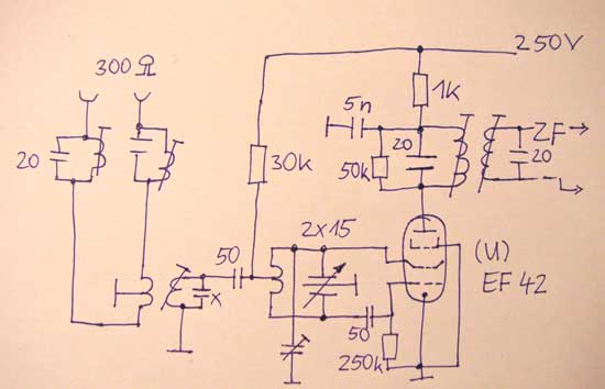 Hallo zusammen, die angekündigte Schaltskizze zur Eingangsstufe des Einbautuners ist hier. Gut zu sehen, dass die Antenne praktisch am Oszillator hängt und daher die Abstrahlung sehr sorgfältig neutralisiert werden muss.
