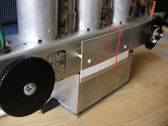 Skalenseil und Skala war mechanisch schon schwieriger. Der Abstimmknopf links ist mit Sekundenkleber mit einer kleinen Umlenkrolle verbunden. Die Original-Umlenkrollen habe ich dazu nicht verwendet. Die Frequenzeinteilung kommt noch, nach dem Abgleich. Die Skale ist so befesstigt, dass ich kleine Chassisöffnungen, die mal für das Typenschild gedacht waren, genutzt habe. Am Originalgehäuse wird dabei nichts verändert, es sind nur Holzstifte.