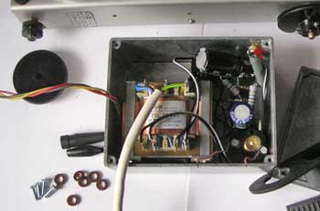 Das Netzteil passt in eine stabile Standard-Alubox. Die Rückseitige Abdeckung der Box habe ich mit Abstandshaltern versehen, so dass mit einer dem Heizkreis parallelen 7V Skalenlampe von Innen her ein schöner Leuchteffekt entsteht. Außerdem ist für Wärmeabfuhr gesorgt. Das Bild zeigt den Test für die geeignete Anordnung in der Box.
