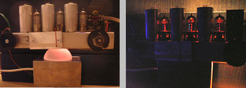 Durch den zweiteiligen Aufbau gibt es viele Möglichkeiten der Anordnung. Links eine Variante mit Glasfuß, der über den Schlitz in der Abdeckung des Netzteils von Innen her beleuchtet wird. Die leicht rötliche Färbung komm über ein Stück untergelegtes farbiges Gummiband. Das zweite Bild zeigt eine weitere Variante im sonst dunklen Raum. Der Phantasie sind ja keine Grenzen gesetzt...