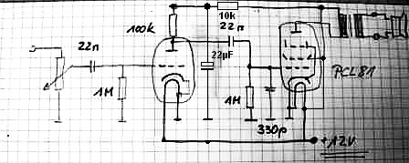 es könnte auch sein, daß die Schaltung schwingt. Lege mal direkt am Gitter1 des L-Systems einen 1k Widerstand und parallel zur Primärseite des NF-Trafos einen 500 oder 1000 pF Kondensator.