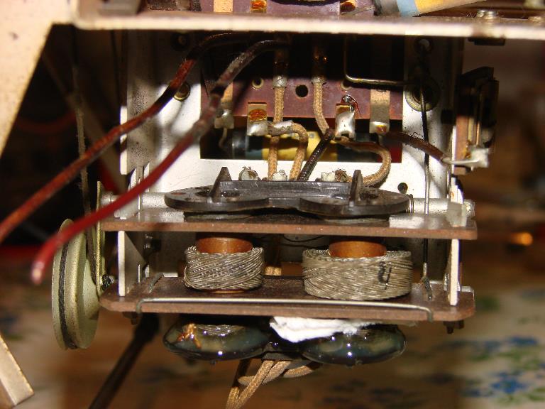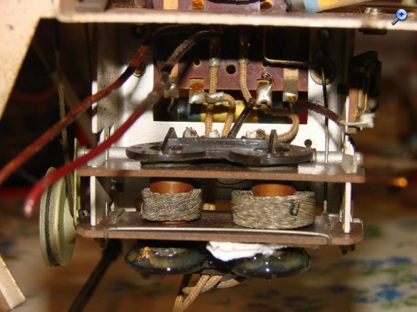 In der Mitte sehen wir die fest montierten Schwinkkreisspulen, die sogar kleine Ferritkerne tragen (hätte ich nicht gedacht bei einem Vorkriegsgerät), oben die Antennenspulen, von denen die LW-Spule von der Schwenkplatte herabgefallen ist, muß ich noch ankleben. Unten die Rückkopplungsspulen, links die beiden Schwenkachsen. Antrieb über Seilzüge.