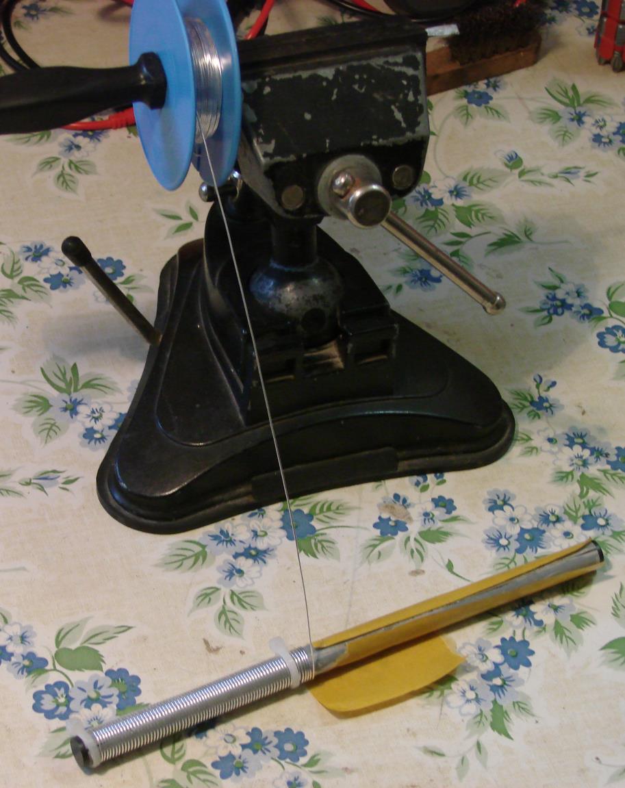 Vorne am Spulensatz-Ständer sieht man den lose klappernden Quetscher