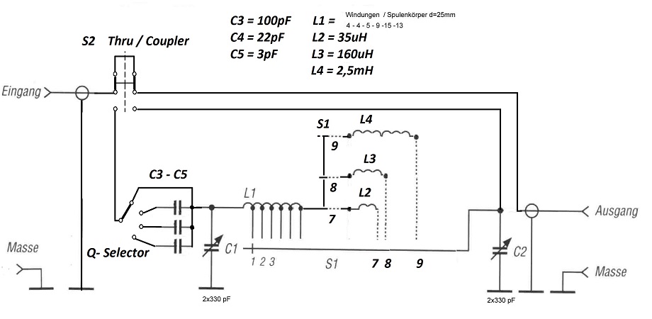 hier wie schon besprochen die Schaltung des T und K DE32 mit dem geheimnisvollen Q- Selector. Die Werte für die drei zusätzlichen Festinduktivitäten habe ich ausgemessen, da keine Bedruckung vorhanden ist. Deine abgelesenen Spulendaten waren richtig, außer das es keine 2x2Wdg.- Windungsabgriffe gibt. Es sind je 4Wdg. Siehe im Plan und damit sind auch nur 9 Schaltstufen vorhanden.. Die letztendliche Verschaltung ist tricky! Die Festinduktivitäten für 0.15-0.3MHz, 0.5-1MHz, 1-1,7MHz hängen beim Anwählen immer in Reihe zur großen Spule mit kommpletter Windungszahl (50Wdg.) Sie werden aber immer voneinander beidseitig getrennt und sind ab 1,7MHz nicht mit im Spiel. Ich habe versucht deine Ur- Skizze zu erweitern. Der verwendete Drehschalter S1 hat zwei unabhängige Kontaktreihen. Damit hat T und K dies realisieren können. Man wollte wohl die hohen Induktivitäten nicht einseitig an der Hauptspule anschließen um Einflüsse und Abstrahlungen zu vermeiden.