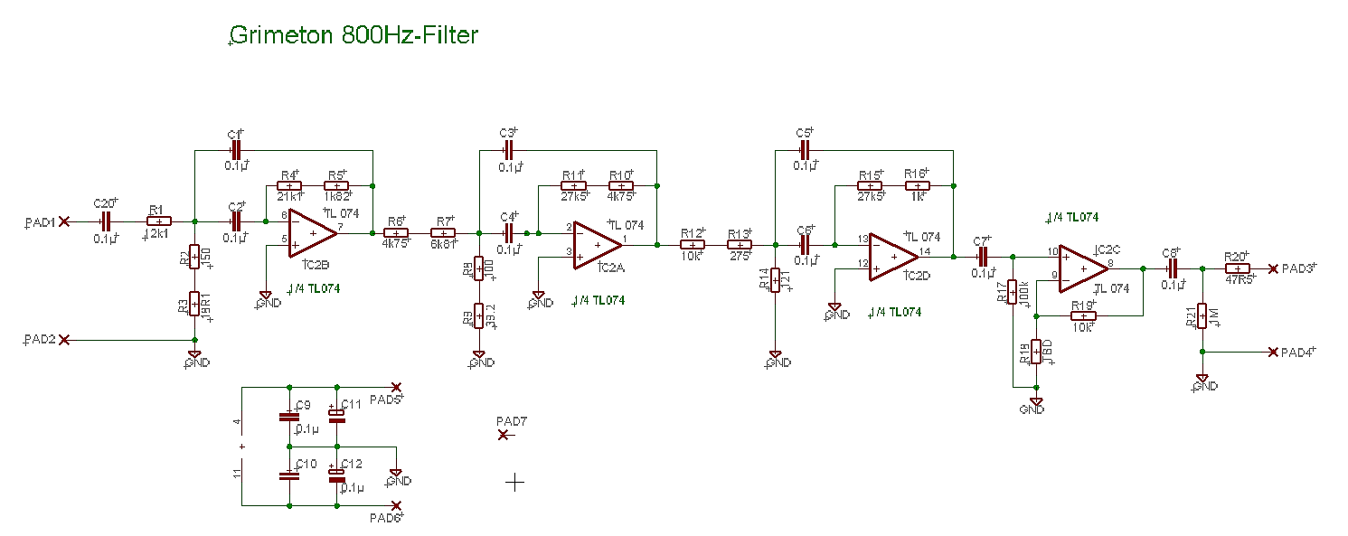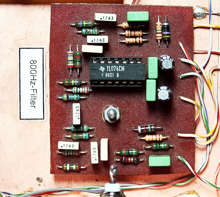 Auch wer ungern hochinduktive Spulen wickelt, hat eine Alternative. Das Heruntermischen der SAQ-Frequenz in den unteren NF-Bereich ist eine "lineare" Operation, etwa im Gegensatz zur Dioden-Demodulation. Man kann daher ohne Nachteile auch im unteren NF-Bereich die nötige Selektion erreichen und etwa ein sechspoliges Bandfilter mit 100Hz Bandbreite und 800Hz Mittenfrequenz mit einem billigen Vierfach-Opamp aufbauen. Das entspricht einem 3fach-LC-Bandfilter. Eine Bessel-Charakteristik ist hier empfehlenswert um das CW-Signal möglichst wenig zu verschleifen oder Einschwingvorgänge (Klingeln) zu minimieren. Schalt- und Berechnungsunterlagen gibt es im Internet, z.B. hier (https://www.ti.com/design-resources/desi...r-designer.html).
