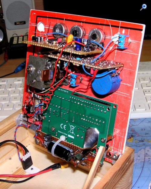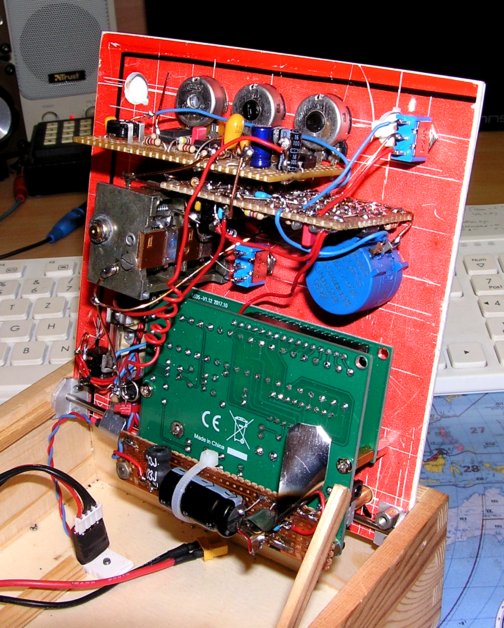 Noch ein Blick in's Innere: Oben die Filterplatine, darunter das Eingangsteil und der Oszillator, rechts das Wendelpoti, links der Drehko. Unten ein kleiner Zähler vom freundlichen Chinamann, der allerdings erst mit ausreichend Abblockmaßnahmen ruhiggestellt werden konnte.
