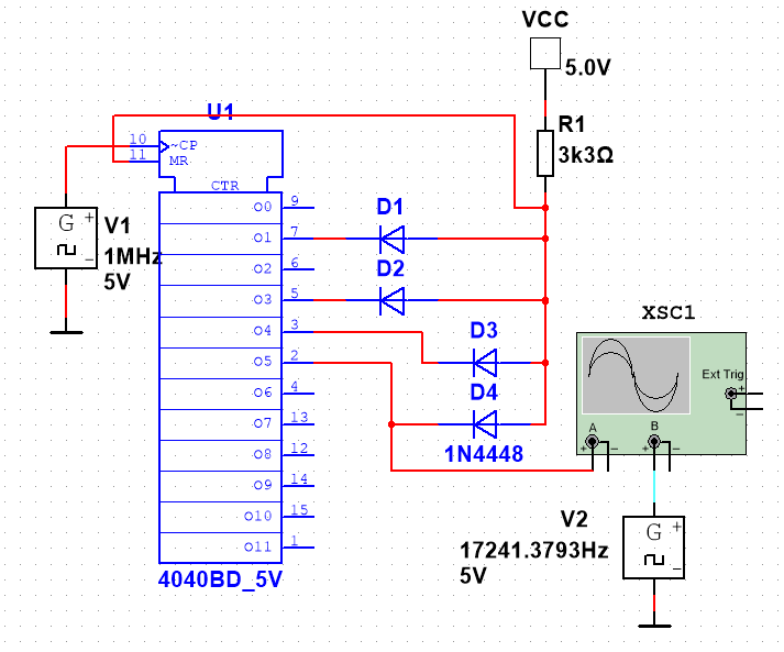 Es hat sich gezeigt, dass nicht die "Diodenlogik" das Problem ist, sondern die Geschwindigkeit des verwendeten SCL4060BE-Bausteins.