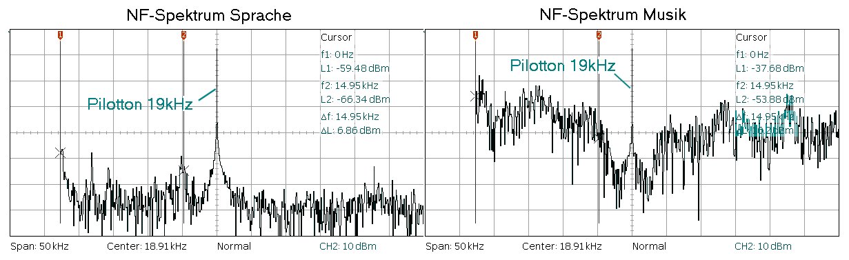 Hallo zusammen, wie bereits angekündigt habe ich jetzt Tuner und ZF-Vertärker, den ich einer umfangreichen Überarbeitung unterzogen habe, gemeinsam auf einer Platte aus Platinenmaterial montiert - das Radio funktioniert. Auf früheren Oszilloskopdarstellungen ist zu erkennen, dass Bandbreite des ZF-Verstärkers und Höckerabstand des Ratiodetektors für eine "satte" NF-Wiedergabe nicht ausreichend waren, von Stereoempfang ganz zu schweigen. Daher habe ich die Kopplung der Bandfilter und des Ratiodektors massiv erhöht und das vorhandene Keramikfilter gegen ein breitbandigeres Filter getauscht. Die Übertragungskurven des geänderten ZF-Verstärkers lassen seine "Stereotauglichkeit" erkennen. Im NF-Spektrum ist der Pilotton mit ausreichender Amplitude vorhanden.