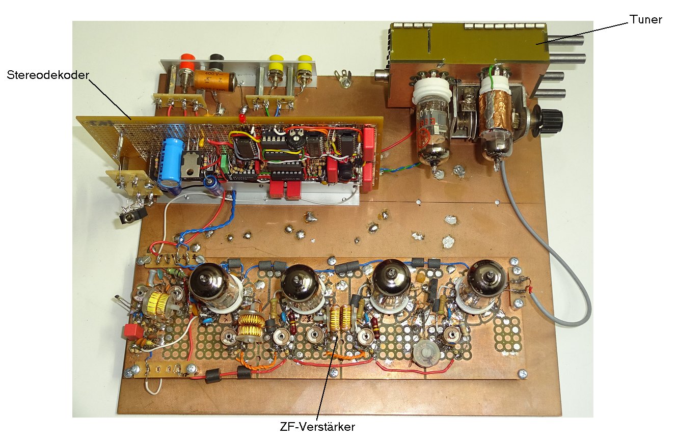 Den aktuellen Zustand des Radios zeigen die folgenden Bilder. Zu den schon vorhandenen Baugruppen, in Röhrentechnik, ist ein Stereodekoder, in Halbleitertechnik, hinzugegekommen.