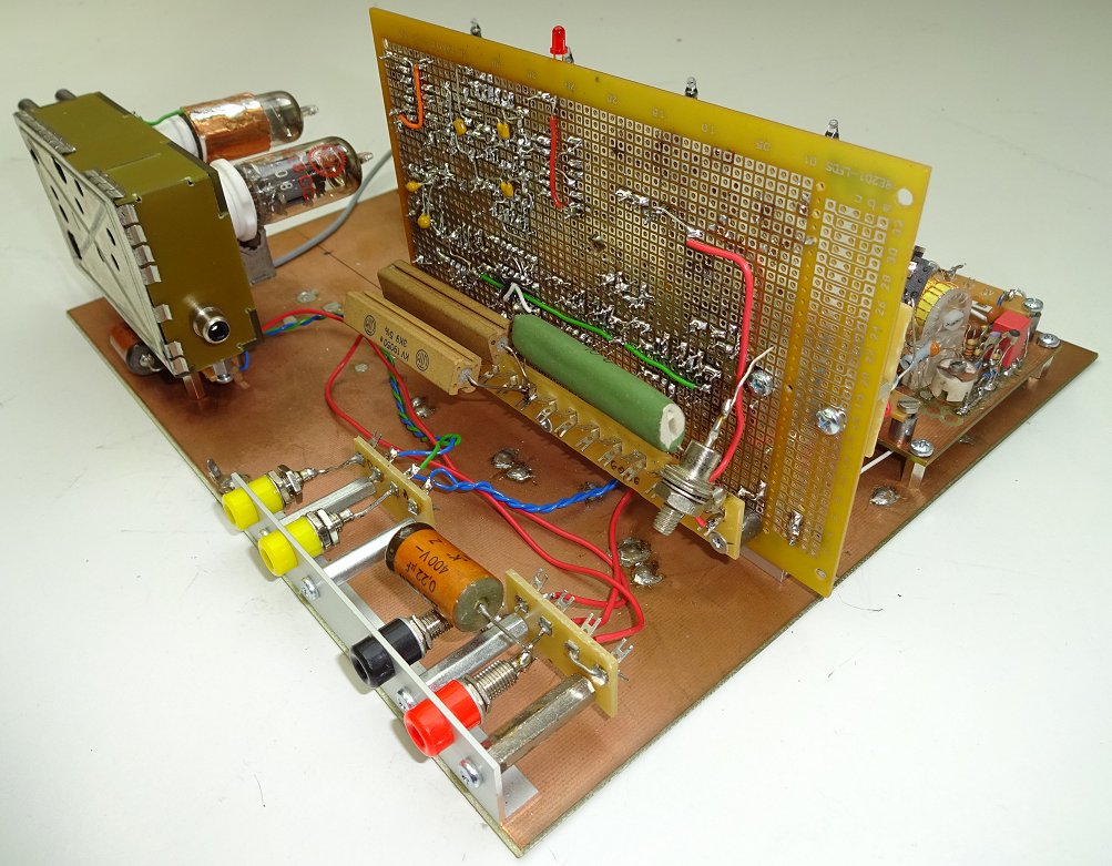 Eigentlich sollte der Dekoder aus der verdoppelten Heizspannung versorgt werden. Wegen des hierbei autretenden starken NF-Brummen habe ich diese Methode verworfen und den Dekoder über belastbare Widerstände (4,15k/12W) direkt an die Anodenspannung angeschlossen. Abhängig vom Betriebszustand des Dekoders schwankt die Spannung am Ende der Widerstandskette erheblich. Daher begrenzt eine Leistungszenerdiode die Betriebsspannung des Dekoders auf einen Wert, mit dem der auf der Vorderseite befindliche Spannungsregler, ohne ihn zu beschädigen, beaufschlagt werden kann.