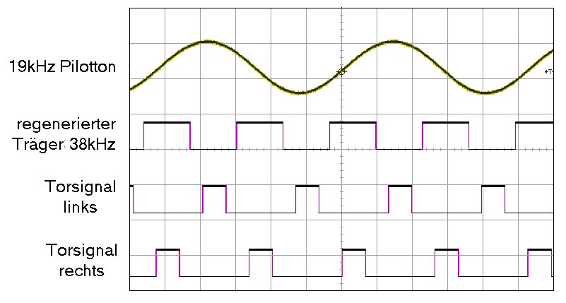 Das Blockschaltbild zeigt die Funktionseinheiten des Dekoders und ihre Beziehungen zueinander. Zentraler Baustein des Dekoders ist ein spannungsgesteuerter Oszillator, der auf 304kHz(=16x19kHz) schwingt. Der Oszillator wird innerhalb einer Regelschleife mit dem (LC-gefilterten) Pilotton phasenstarr gekoppelt. Mit Hilfe eines Frequenzteilers, der Bestandteil der Schleife ist, und etwas digitaler Logik werden die Signale für die MPX-Schalter erzeugt. Diese Signale sind nur während eines Viertels der Hilfsträgerfrequenz aktiv, sodass sie mit einer Phasenbrücke (eigentlich eine Halbbrücke), die ebenfalls Schleifenbestandteil ist, auf optimale Kanaltrennung ausgerichtet werden können. Die MPX-Schalter sind der Einfachheit halber im Signalweg angeordnet - sie arbeiten als Gegentaktschalter. Ihnen folgen Tiefpässe mit einer Grenzfrequenz von 10kHz. Ein hysteresebehafteter Schmitt-Trigger wertet die Pilottonamplitude aus und zeigt eine ausreichende Signalstärke an.