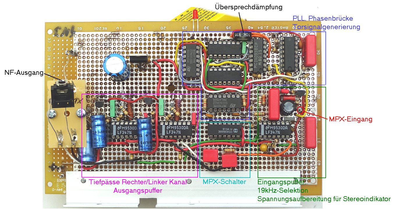 Ursprünglich beabschtigte ich, den Dekoder mit Röhren, Spulen usw aufzubauen. Wegen der Bauteilesituation in meiner Bastelkiste habe ich letztendlich Halbleiter verwendet, was meiner Ansicht nach ein lässlicher Stilbruch ist - immerhin wurden in den (Röhren-)Radios des ausgehenden Röhrenzeitalters, sofern sie mit einem Stereodekoder ausgestattet waren, transistorisierte Dekoder verwendet.