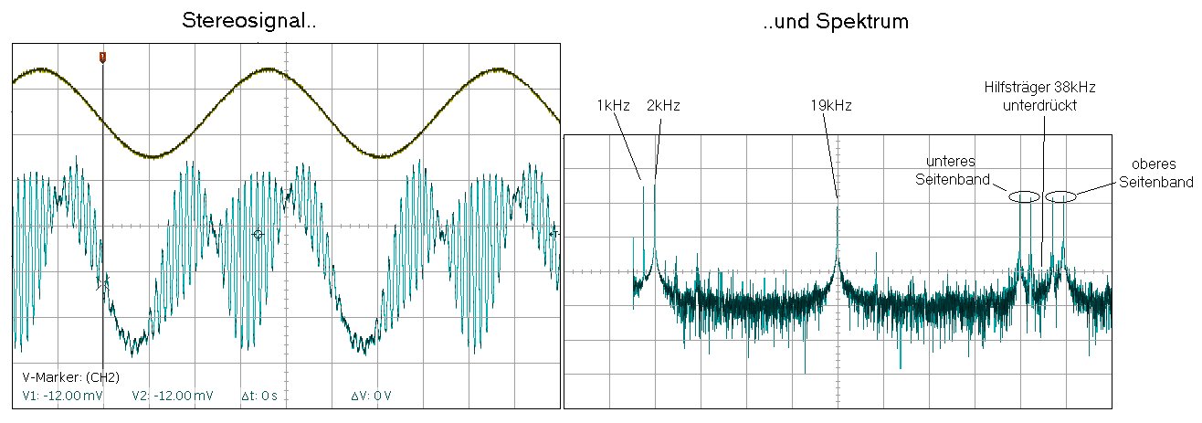Mit dem von HB9 im Forum veröffentlichten Stereoencoder, dessen Digitalteil wegen des kaum erhältlichen 7MHz Quarzes modifiziert ist, habe ich die Kanaltrennung des Dekoders überprüft. Das MPX-Signal wird mit 1kHz im linken und 2kHz im rechten Kanal erzeugt.