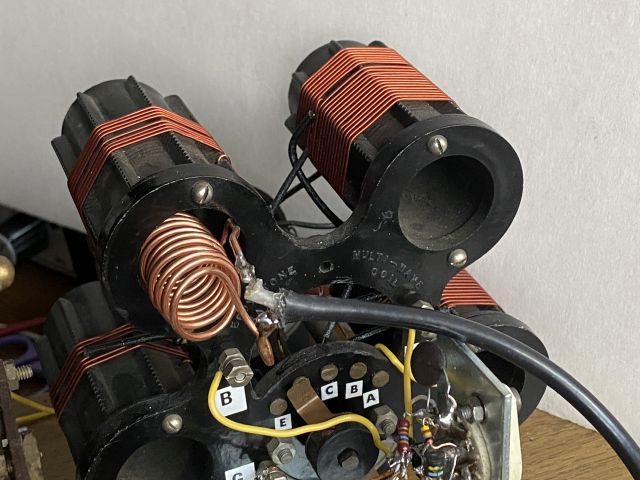 Die induktive Kopplung der Antenne hat auch meine Schaltung verbessert. Wirklich interessant finde ich das Bild: die vier Spulen und der Umschalter haben eine Kunststoff-Grundplatte! Das ganze sieht nach Fabrik-Produktion aus. Erstaunlich! Kurzwelle war schon immer Nische und trotzdem hat jemand das gebaut. Ich kenne noch "Oma's Röhrensuper" mit ECH81 und Kurzwelle bis 25MHz. Da war Sendereinstellung kaum möglich.