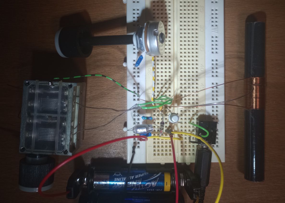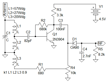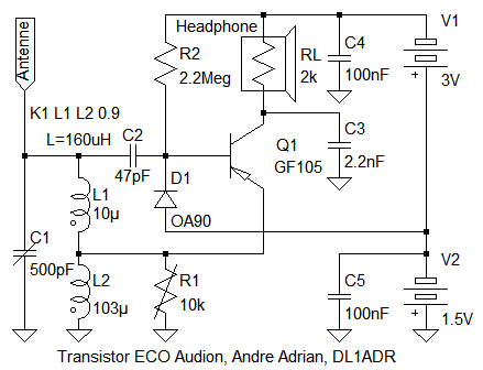 Die Schwingkreis-Induktivität ist geteilt. Dabei hat der untere Teil 33 Windungen, der obere 9 Windungen. Der Ferritstab ist 10cm lang, hat 12.7mm Durchmesser und ist aus Ferritmaterial 61. Der Schleifer des RK-Poti R1 wird auf Masse gelegt. Ich finde RK-Einstellung durch Schwingkreis-Dämpfung eine gute Idee. Obwohl eine Änderung der RK immer noch die Empfangsfrequenz ändert. Die Gitterkombination besteht aus C2, R2, D1. Zwischen Basis und Emitter gibt es einen Spannungsunterschied von einer Dioden-Durchlass-Spannung. Schon dafür ist eine Gitterkombination nötig. Die Nestel-Audion Diode D1 ist nicht an Masse angeschlossen sondern an eine kleine Spannung. Nur dadurch funktioniert die Spice Simulation der Schaltung und der Schaltungsaufbau. In der Zwischenzeit habe ich einige RFT Transistoren bekommen: GC116, GC121, GC122, GF100, GF105 und GS100. Alle sind im "Blechgehäuse".