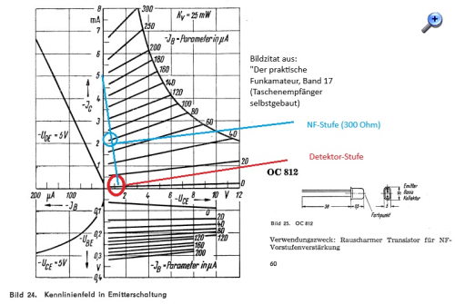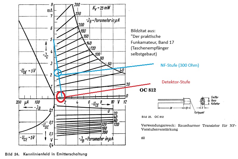 Ich denke, der Arbeitspunkt wird ganz bewusst bei dieser und ähnlichen Schaltungen in einen Bereich gelegt (roter Kreis), wo man einigermaßen verzerrungsarm nur mit kleinen Wechselspannungen arbeiten kann, den Detektor-Kreis aber dafür weniger belastet. Einen Basis-Widerstand braucht man nicht, den benutzt man ja nur, um einen anderen Arbeitspunkt, meist Kennlinienfeld-Mitte, festzulegen. Limann macht das beim zweiten Transistor, mit dem 100 kOhm-Basiswiderstand wird ein Basis - Vorstrom erzeugt, so dass der Kopfhörer entsprechend ausgesteuert werden kann.