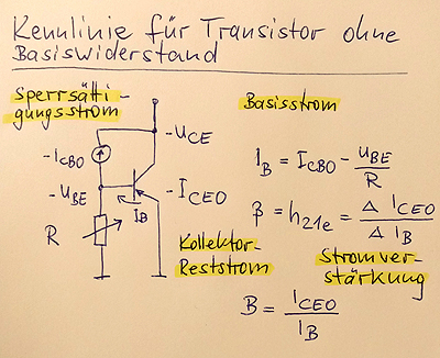 Die Kollektor-Basis-Strecke ist in Sperrichtung des PN-Übergangs gepolt, es fließt ein Sperrsättigungsstrom -ICB0. Dieser enthält nur Ladungsträger aus der thermischen Leitfähigkeit des Halbleitermaterials, ist nahezu konstant, aber stark abhängig von der Kristalltemperatur (so ähnlich wie ein Heißleiter). Wir haben da also eine Konstantstromquelle, solange die Temperatureinflüsse ausgeklammert werden.