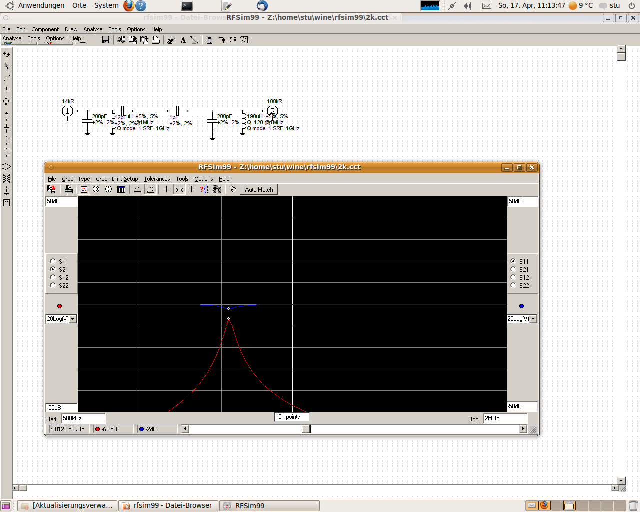 Hallo Reiner. Die 1pF sind schon richtig angegeben.Ich habe versucht die Schaltung zu simulieren. Die Werte die ich eingetragen habe sind Schätzwerte.Es wird wohl viel von der Güte der verwendeten Spulen abhängen. 7db Dämpfung wären schön.Ich vermute aber den tatsächlichen Wert bei -15 bis -20 dB Momentan suche ich noch Zwei keramische Mehrkammer Spulenkörper.Sollte ich diese bekommen, dann versuche ich auch noch einige Kurzwellenbänder mit hinein zu bekommen.Die Antennen Koppelwiklung möchte ich auch noch unterteilen und Schaltbar machen um so die Anpassung zu verbessern.Also noch viel zu basteln und zu verbessern. :-)