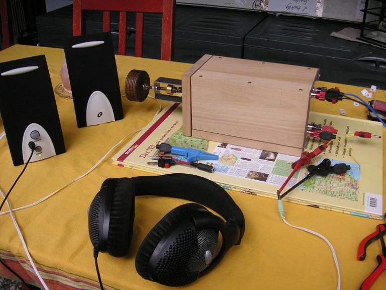 Ich hatte dann noch eine lustige Idee, um festzustellen wieviel Stationen überhaupt mit dem Resonator eingefangen und auch demoduliert werden. Da ich mit dem Hörer ja nur 3 Stationen im Garten ausmachen kann, schloss ich einfache PC- Lautsprecher an. Da kein lautes Signal zu erwarten war, stöpselte ich meinen guten Sennheiser ein, um noch das kleinste Piep zu hören.