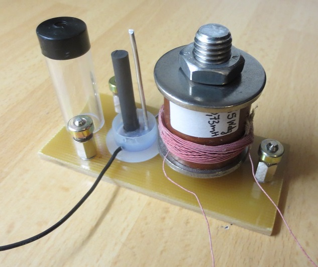 Ich setze die Zelle auf eine Minigrundplatte und setze die Würgespule (2mH) auch gleich mit drauf. Drei Anschlüsse gibt es dann. 1x Würger (in) vom Fritter, 2x pol. Relais +/-) . Die Höhe der Kapazität steuere ich über den Füllstand und nehme keine Alu- Wendel ...sondern eine gerade Elektrode. So wie bei Deiner ersten vorgestellten Version. 1µ sind völlig ok, das habe ich ja schon mit Elko probiert.